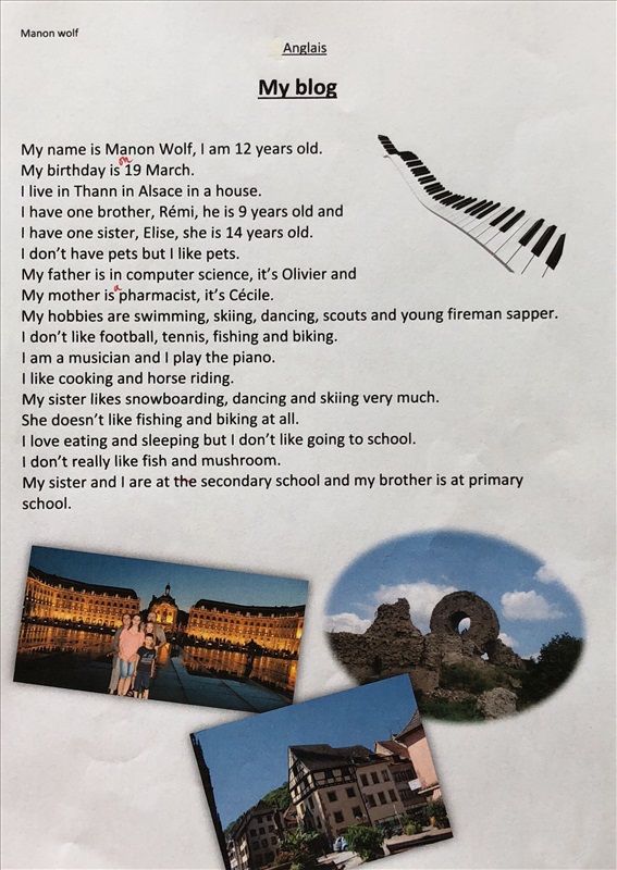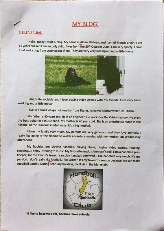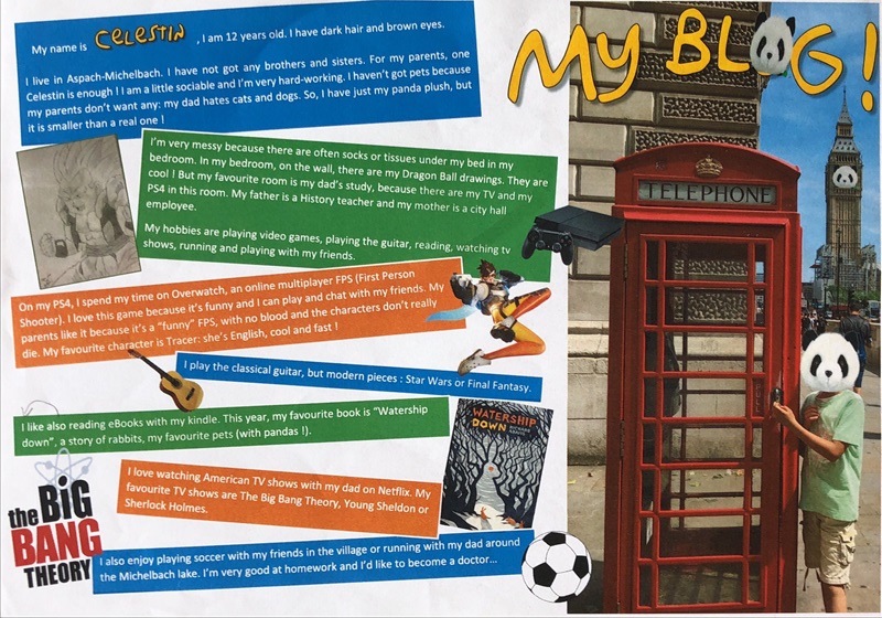 Les élèves de 5e de Mme Rethaber ont travaillé cette année sur le thème du blog. Ils devaient se présenter en anglais, en une page, illustrée de quelques photos. Voici quelques unes des productions de la 5eC... |