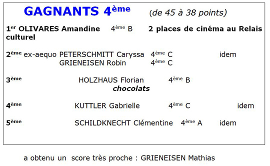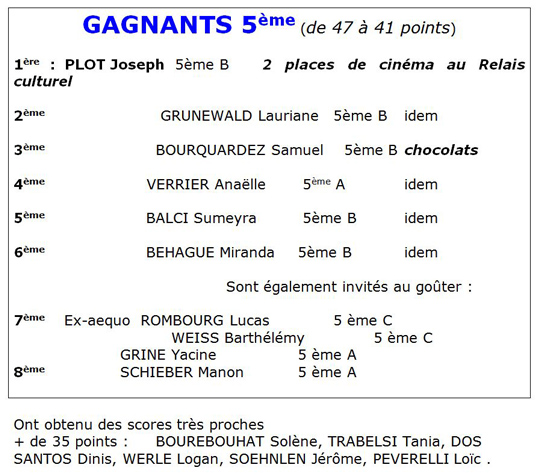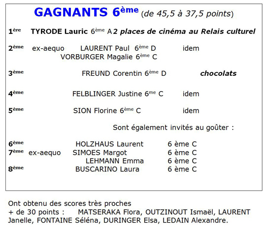En 6ème, 16 élèves ont rendu leur questionnaire quasiment complet ; 10 élèves ont obtenu plus de 37,5 points (sur un total de 49) BRAVO |