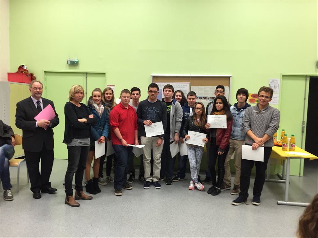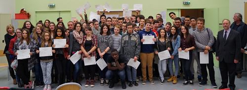 C'est une cérémonie un peu particulière que le collège Faesch a accueillie vendredi 28 Novembre, en effet pour la première fois les élèves de 3e de l'an passé ont été conviés pour une remise des diplômes du Brevet par le Principal, M. Grunenwald. La session 2014 a été marquée une fois de plus par les excellents résultats obtenus par les élèves du Collège Faesch, puisque 94.8% des candidats ont été reçus (la moyenne académique étant de 85,6%). Une belle moisson de mentions également puisque 70% ont décroché une mention (16 mentions TB, 13 mentions B et 22 mentions AB) ! La plupart de nos ex-3e ont répondu favorablement à l'invitation et sont venus recevoir leur premier diplôme des mains de leur ancien professeur principal. Les élèves, comme les enseignants venus à leur rencontre, ont pu partager un moment fort sympathique durant ces retrouvailles. Les rires, la joie, les applaudissements et les "selfies" n'ont pas manqué au cours de cette soirée... Une bien belle tradition qui débute au Collège Faesch désormais... |