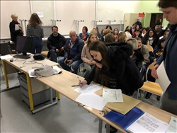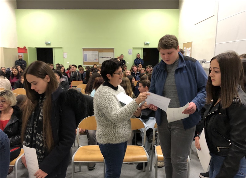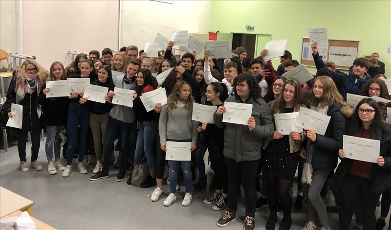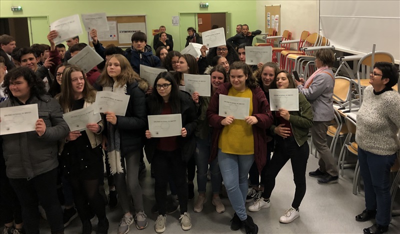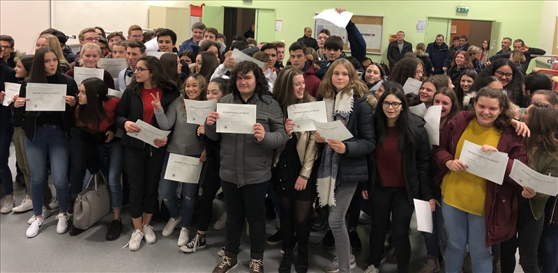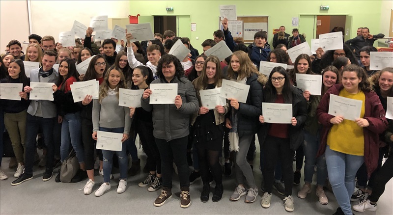 Cette année encore, les élèves lauréats du Diplôme National du Brevet ont été mis à l'honneur au cours d'une cérémonie, le 22 Novembre dernier, animée par la Principale, Mme Blois. Cette année encore, les élèves du Collège Faesch se sont distingués par un taux de réussite de près de 10 points au-dessus de la moyenne académique, avec 97,4 % d'élèves reçus, dont presque tous avec une mention ! Encore toutes nos félicitations aux heureux lauréats ! |