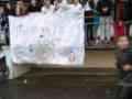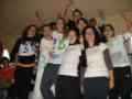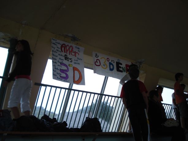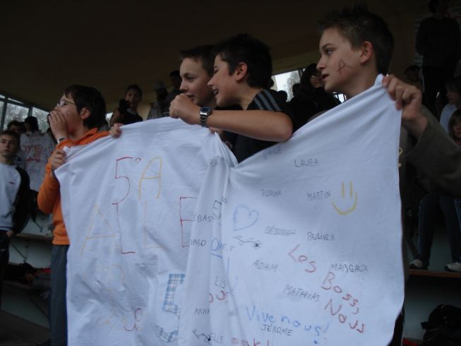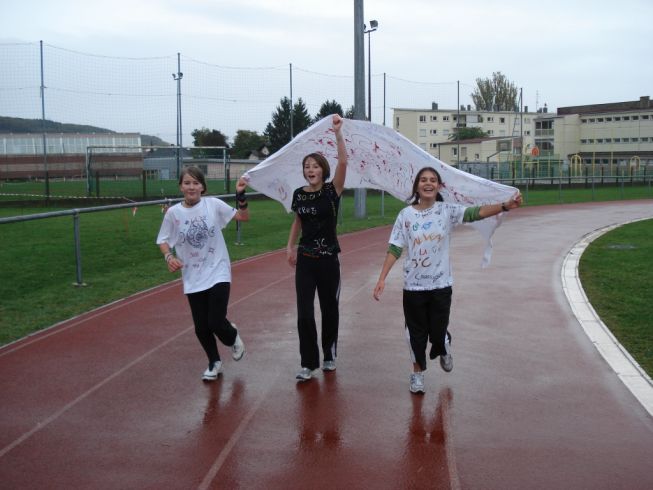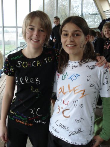 Cette année les élèves semblaient s'être passés le mot et les coureurs ont pu bénéficier de groupes de supporters impressionnants ! C'est ainsi que les gradins du stade municipal ont vu fleurir banderoles et T-Shirts décorés à la gloire d'une classe ou d'un élève. Cet enthousiasme s'est même traduit par diverses "peintures de guerre" corporelles. En tout cas ce n'était pas une ambiance de frimas d'automne que nous ont offert les élèves du collège ! |