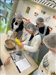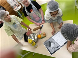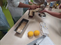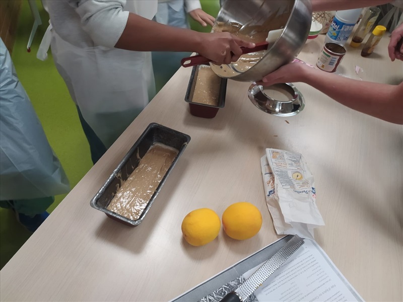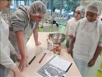 Répartis en petits groupes, ces jeunes cuisiniers d’un jour ont alors pu apprendre à faire un carrot cake et un pain d’épices. Sous la surveillance du chef, les jeunes ont dû lire les recettes et rassembler les ingrédients. Une belle occasion d’apprendre des gestes techniques, du vocabulaire mais aussi de coopérer. |