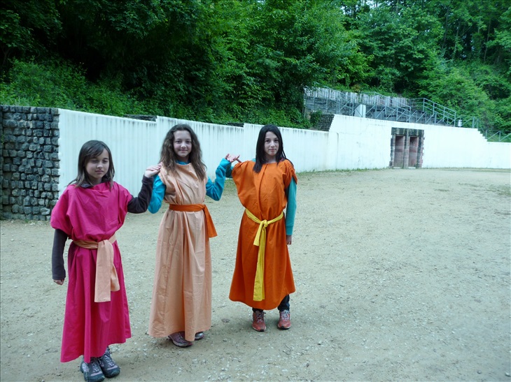 A l’amphithéâtre, en pleine nature, ils ont pique-niqué en profitant d’un ciel miraculeusement clément jusque-là et certains ont organisé des combats de gladiateurs sur l’arène avec épées et boucliers de bois tandis que d’autres revêtaient la toga des citoyens, la stola des romaines ou la tunica des esclaves.