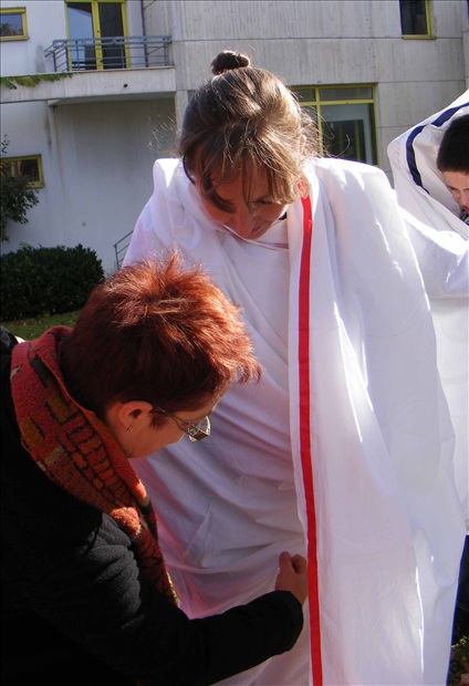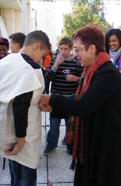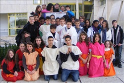 Après un prandium (déjeuner romain) partagé entre 5° latinistes et 4° sur le parvis ensoleillé du Capitole, ils se sont habillés en romain, qui d’une toge de citoyen, qui d’une stola de romaine, qui d’une tunica d’esclave -sans oublier M. Ferrari !-, avant de regagner le collège pour les cours de l’après-midi. |