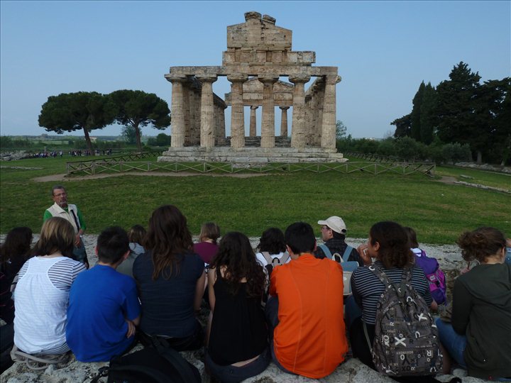 Mardi, à Paestum, ils ont foulé l’antique Poséidonia grecque avec ses temples et son musée le matin, sous le charme d’Angelo, leur guide, puis visité une fromagerie artisanale de mozzarella di bufala et l’élevage de buflones qui leur fournit le lait. Après une détente à la plage, ils ont écouté le cours de M. Ferrari et Melle Mack s’y afférant. |